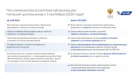 Закон включает в себя внесенные главой государства ко второму чтению поправки в целях реализации положений его послания Федеральному собранию от 15 января 2020 года, которые позволяют обеспечить бесплатным питанием детей, обучающихся в начальной школе, начиная с 1 сентября 2020 года с учетом переходного периода до 1 сентября 2023 года. согласно закону, учащиеся младших классов должны обеспечиваться бесплатным горячим питанием не реже одного раза в день, а в меню должны быть и горячее блюдо, и горячий напиток.